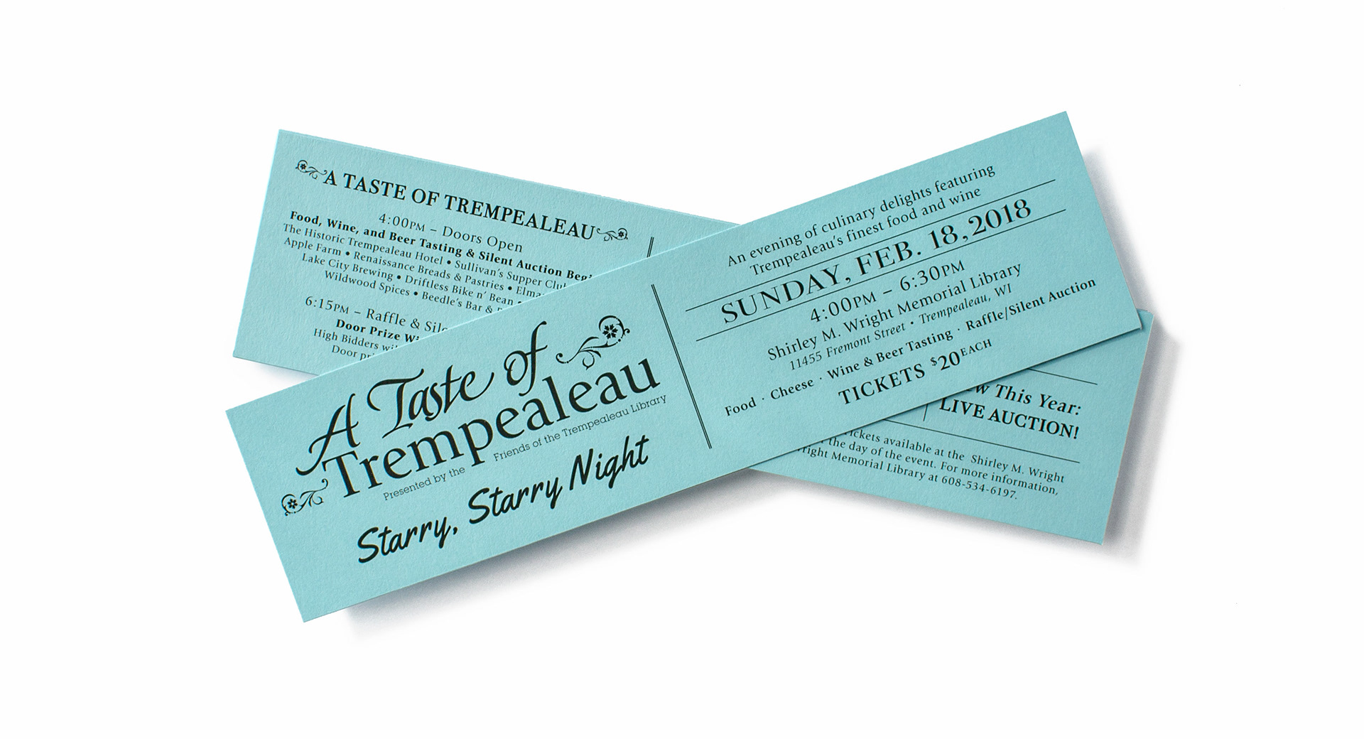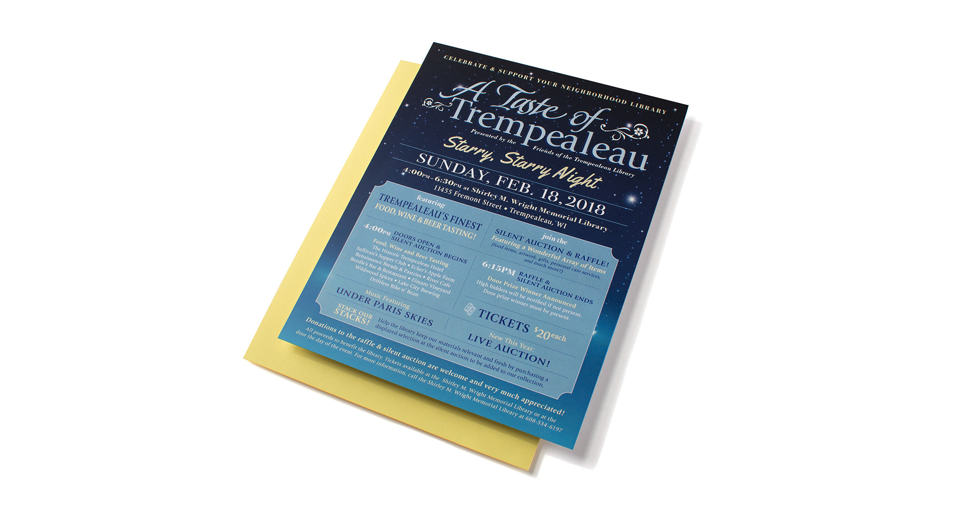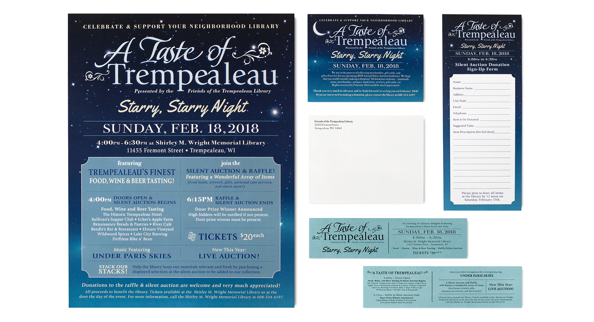 A Taste of Trempealeau is an annual local food, wine and beer fundraiser event. The design was based on the theme of “Starry Night”. All marketing materials were designed and printed in-house. Materials included postcards, flyers, handouts, raffle tickets, donation sign-up forms, and table signs.