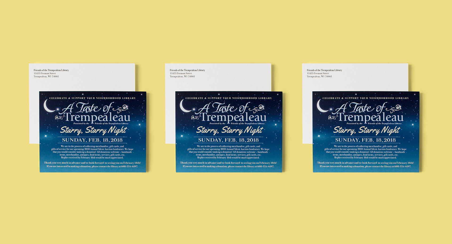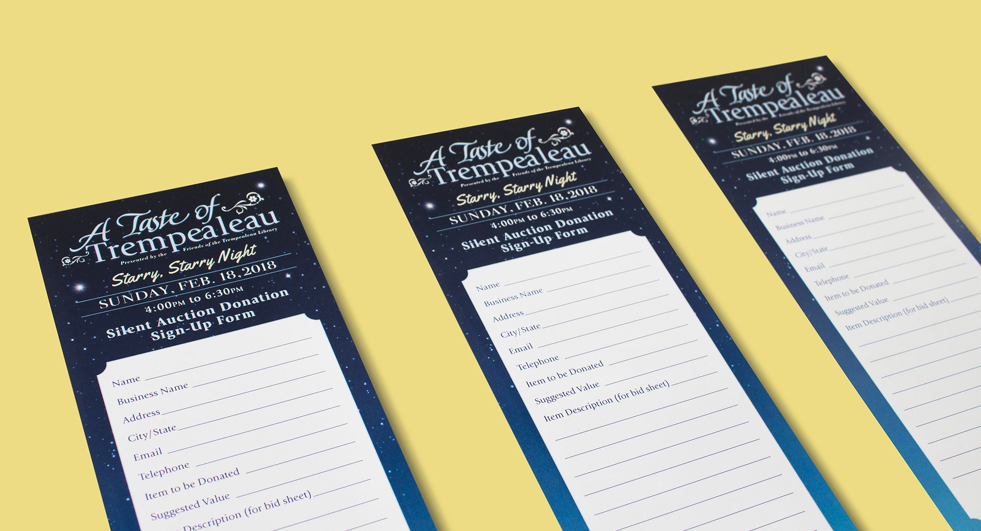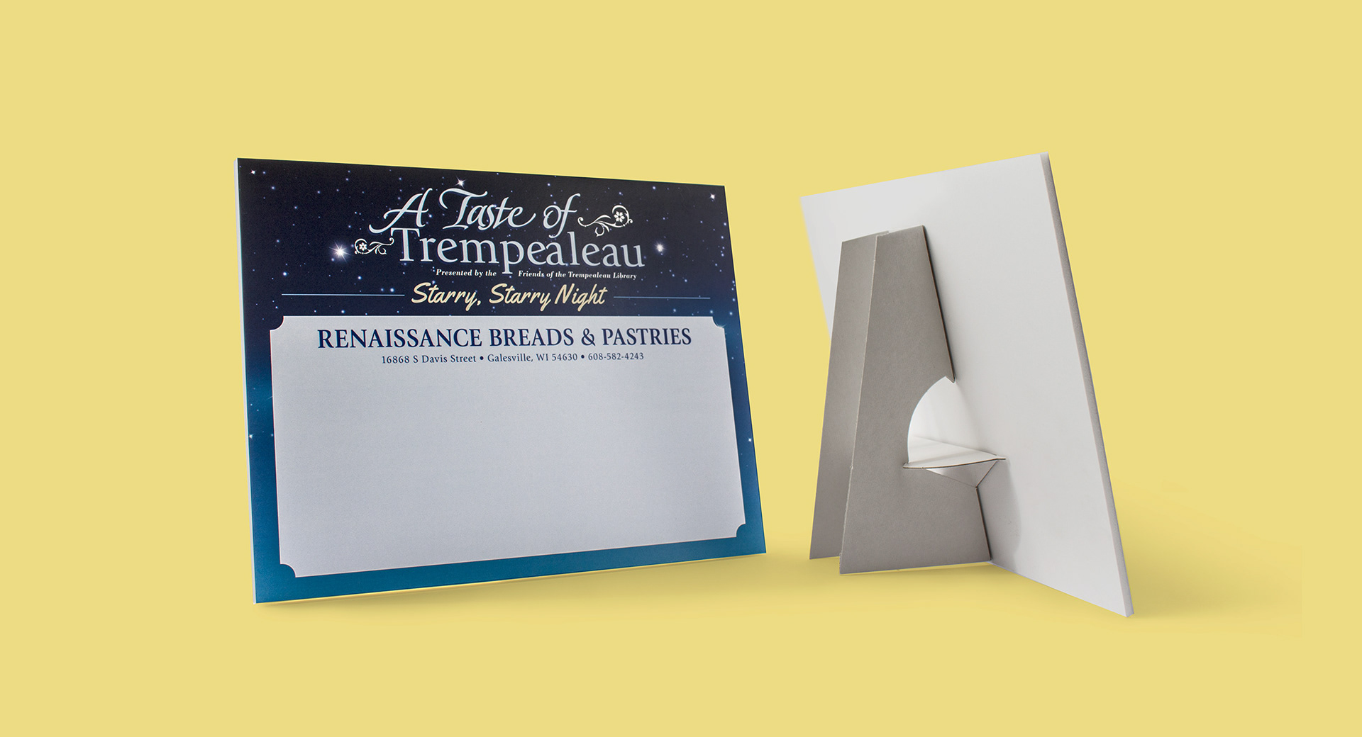 A Taste of Trempealeau is an annual local food, wine and beer fundraiser event. The design was based on the theme of “Starry Night”. All marketing materials were designed and printed in-house. Materials included postcards, flyers, handouts, raffle tickets, donation sign-up forms, and table signs.